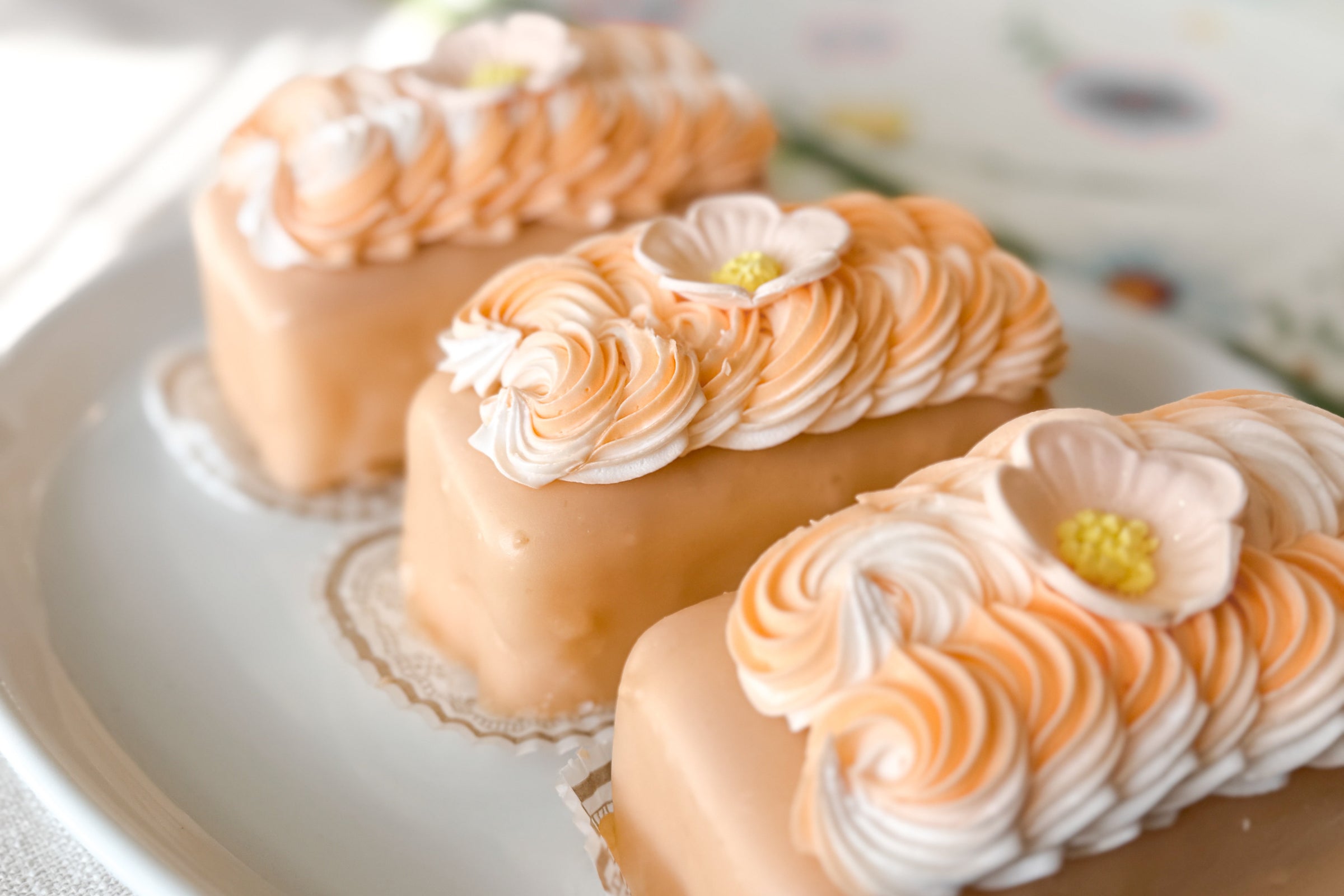 A mini dessert made of orange cake, dipped in fondant and topped with an orange and white buttercream swirl.